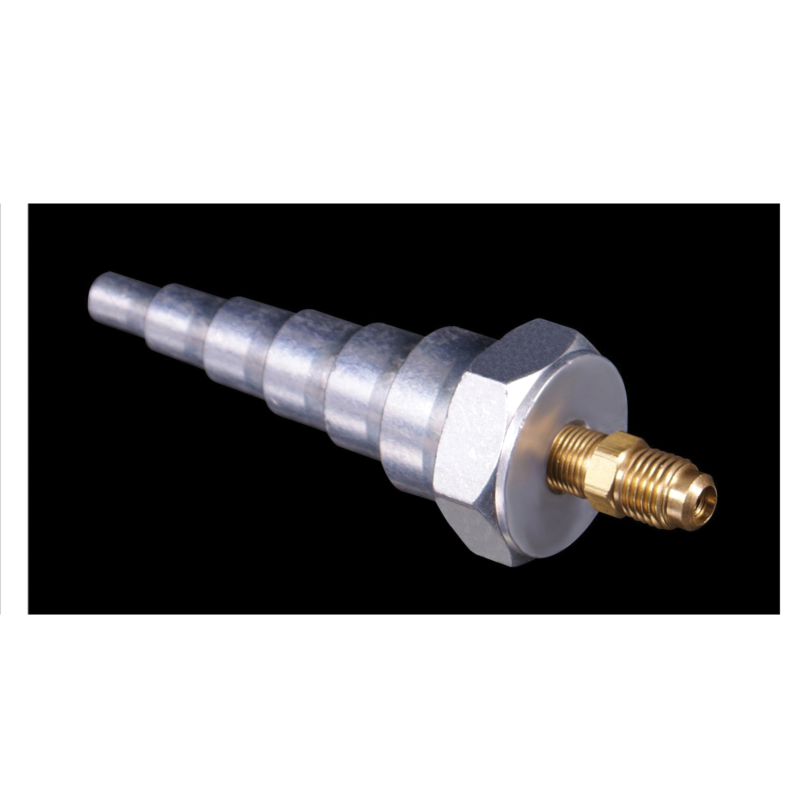 Quickly connects to manifold gauge hose, and slips easily and securely into pipe. Allows for bleed of nitrogen through pipe being brazed, keeping the pipes clean and oxide-free. Stepped to fit most common arc pipe sizes, making it fast to go from one tube to the next. Saves time and money and helps maintain equipment manufacturer's system performance and installation guidelines. No more duct taping your hoses to the pipe.