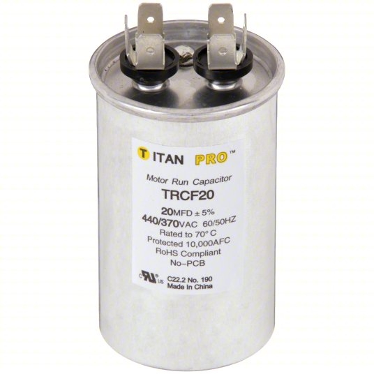 Packard TITAN PRO® Motor Run Capacitor, 20 uF, 370/440 V, Round, Aluminum Housing, 1.77 in Dia, 2.95 in Overall Height, 1 Sections
