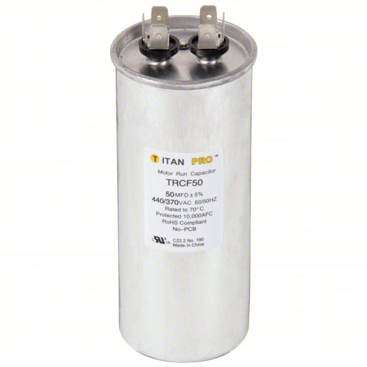 Packard TITAN PRO® Motor Run Capacitor, 50 uF, 370/440 V, Round, Aluminum Housing, 1.97 in Dia, 4.72 in Overall Height, 1 Sections
