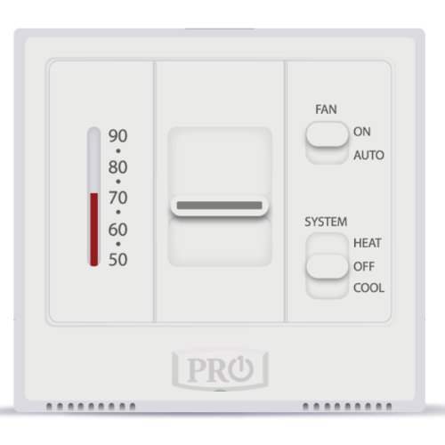 PRO1® Thermostat, 18 to 30 VAC, 1 Heat/1 Cool Stages, 0.2 to 2 deg F Heating and Cooling Differential, 32 to 105 deg F, 90% Non-Condensing Humidity, +/-1 deg F Accuracy, Dimensions: 4.4 in H x 4.7 in W x 1.1 in D